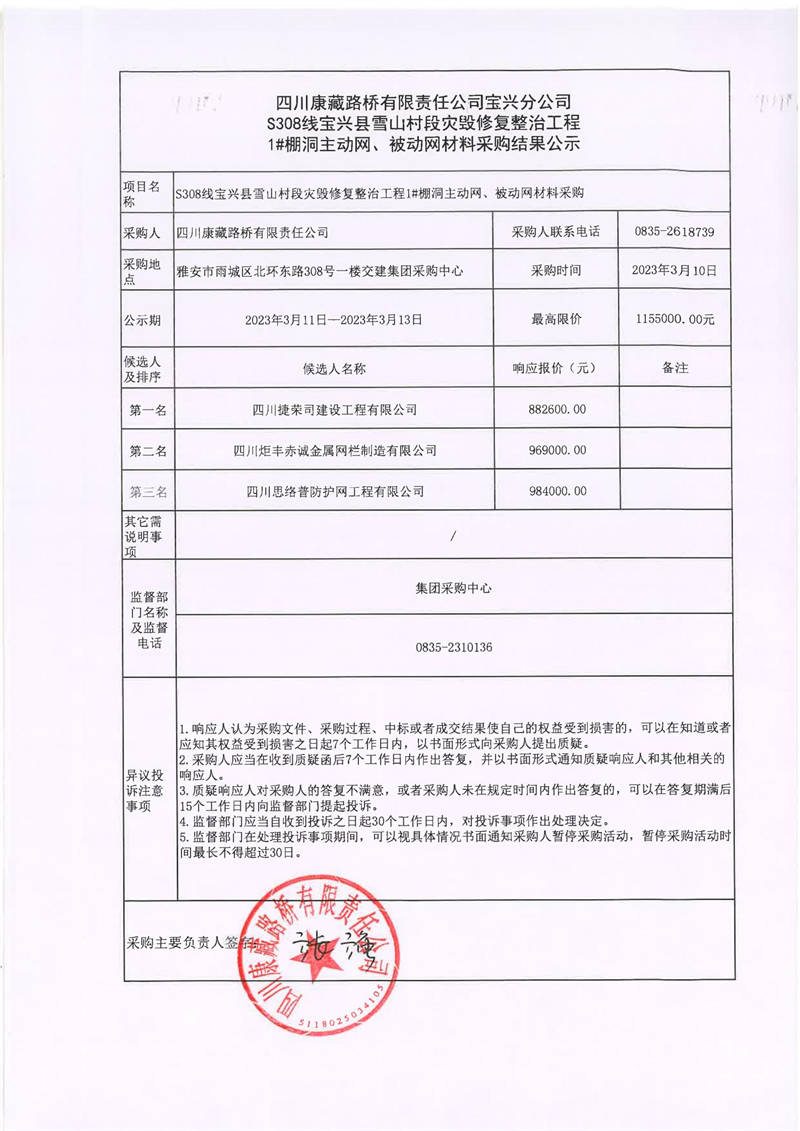 四川康藏路橋有限責任公司寶興分公司S308線寶興縣雪山村段災毀修復整治工程1#棚洞主動網(wǎng)、被動網(wǎng)材料采購結(jié)果公示