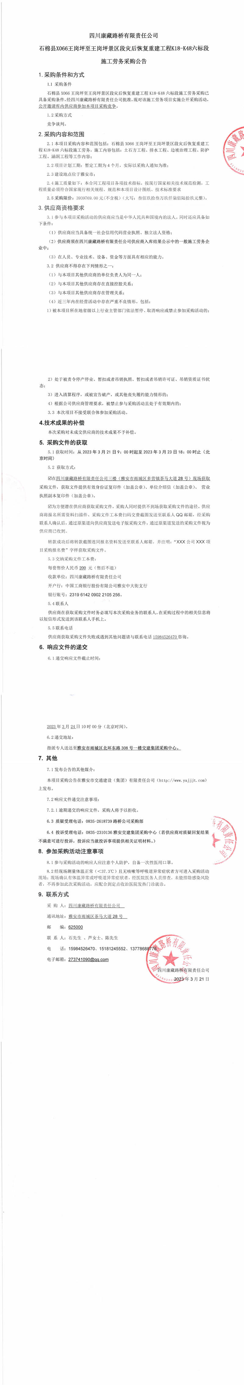 四川康藏路橋有限責(zé)任公司石棉縣X066王崗坪至王崗坪景區(qū)段災(zāi)后恢復(fù)重建工程K18-K48六標段施工勞務(wù)采購公告