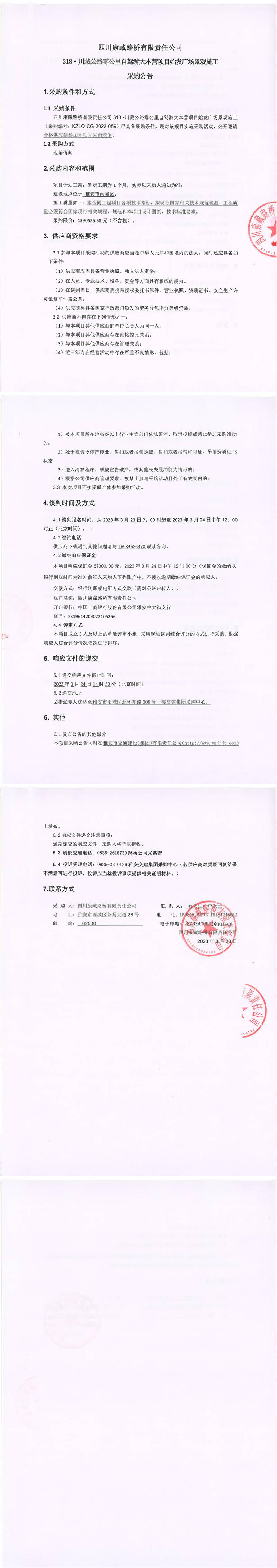 四川康藏路橋有限責(zé)任公司318·川藏公路零公里自駕游大本營項(xiàng)目始發(fā)廣場(chǎng)景觀施工采購公告