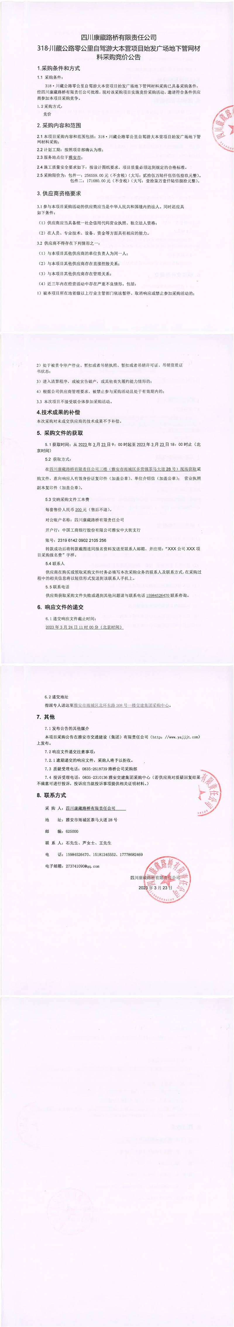 四川康藏路橋有限責(zé)任公司318·川藏公路零公里自駕游大本營項(xiàng)目始發(fā)廣場地下管網(wǎng)材料采購競價公告