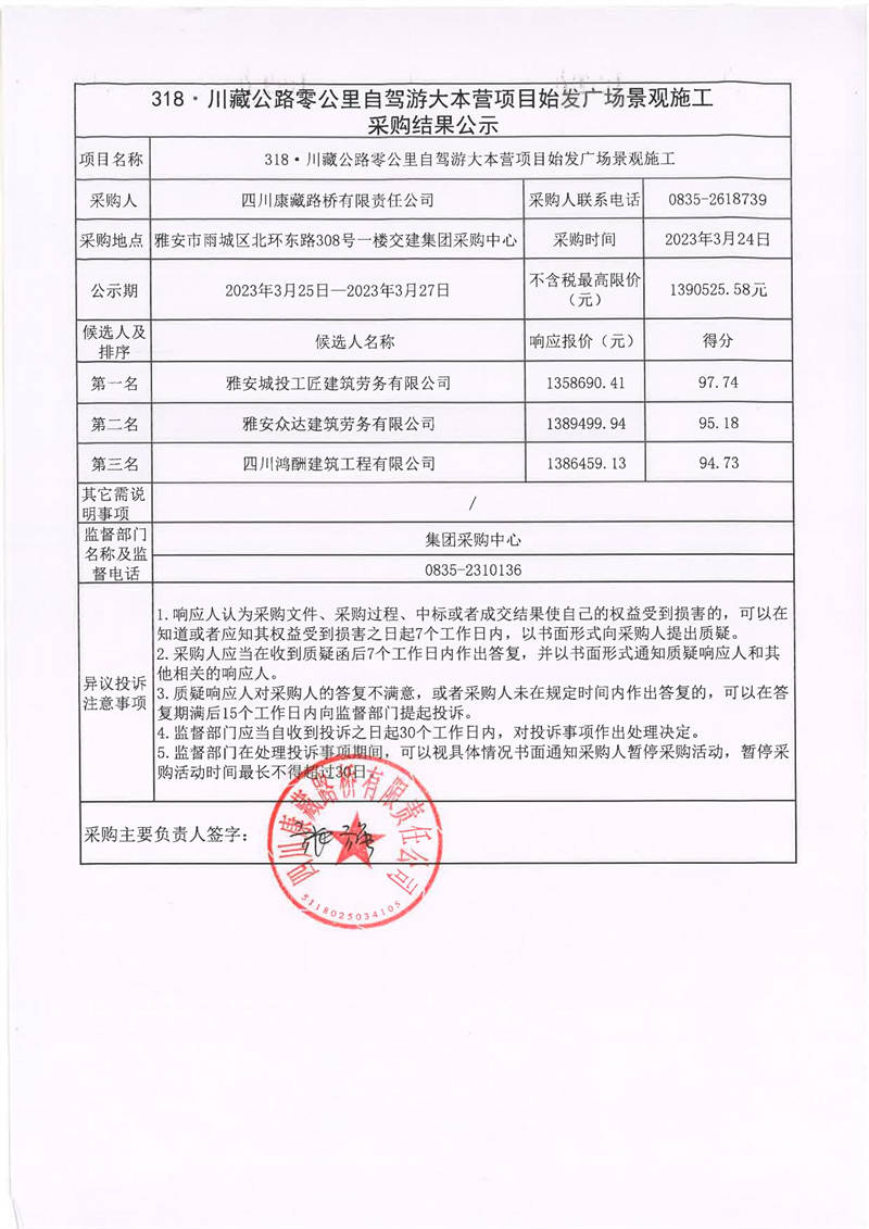四川康藏路橋有限責(zé)任公司318·川藏公路零公里自駕游大本營項目始發(fā)廣場景觀施工采購結(jié)果公示