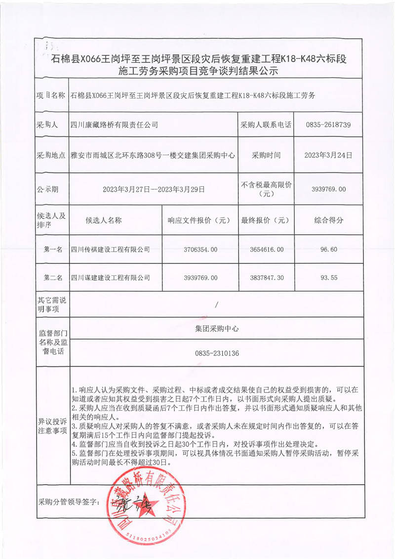 四川康藏路橋有限責(zé)任公司S431蘆山縣龍門至雙石段改建工程項(xiàng)目K18+000-K23+000路路基附屬工程施工勞務(wù)采購(gòu)項(xiàng)目競(jìng)爭(zhēng)談判結(jié)果公示