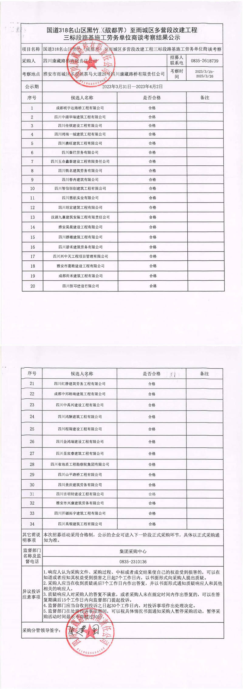 四川康藏路橋有限責任公司國道318名山區(qū)黑竹(成都界)至雨城區(qū)多營段改建工程三標段橋梁施工勞務(wù)單位商談考察結(jié)果公示