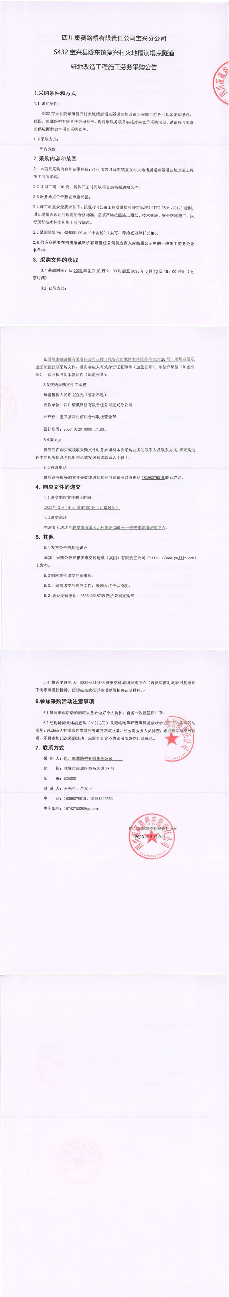 四川康藏路橋有限責(zé)任公司寶興分公司S432寶興縣隴東鎮(zhèn)復(fù)興村火地槽崩塌點(diǎn)隧道駐地改造工程施工勞務(wù)采購(gòu)公告
