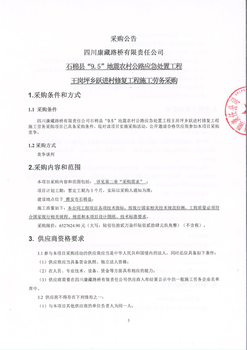 四川康藏路橋有限責(zé)任公司石棉縣“9.5”地震農(nóng)村公路應(yīng)急處置工程王崗坪鄉(xiāng)躍進(jìn)村修復(fù)工程施工勞務(wù)采購(gòu)公告