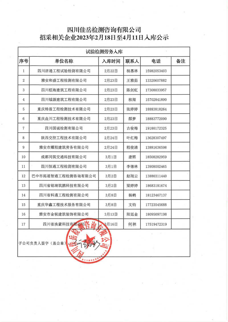 四川佳岳檢測咨詢有限公司(試驗檢測勞務(wù)供應(yīng)商庫)2023年2月18日至4月11日入庫結(jié)果公示