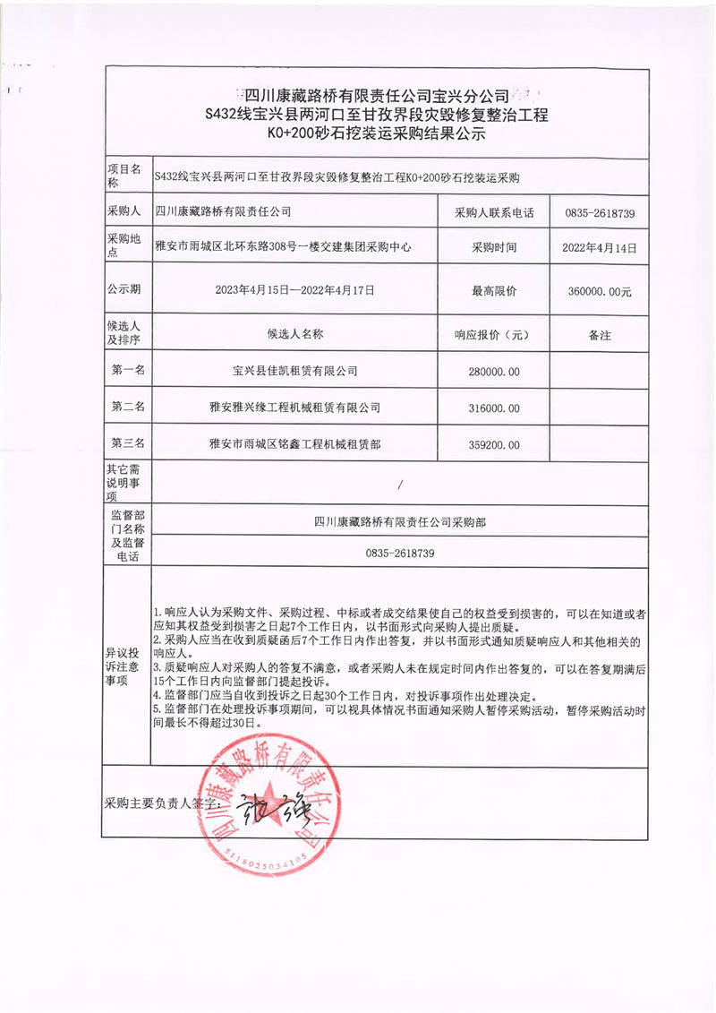 四川康藏路橋有限責(zé)任公司寶興分公司S432線寶興縣兩河口至甘孜界段災(zāi)毀修復(fù)整治工程K0+200砂石挖裝運采購結(jié)果公示