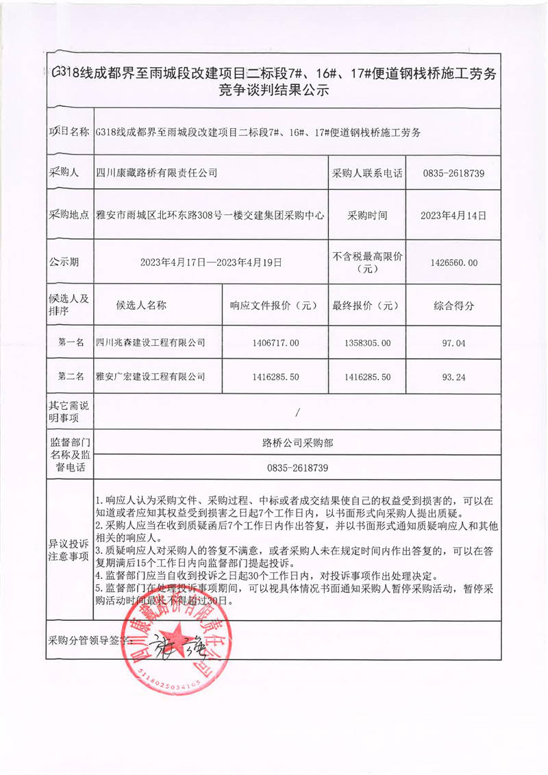 四川康藏路橋有限責任公司G318線成都至雨城段改建項目二標段7#、16#、17#便道鋼棧橋施工勞務(wù)競爭談判結(jié)果公示