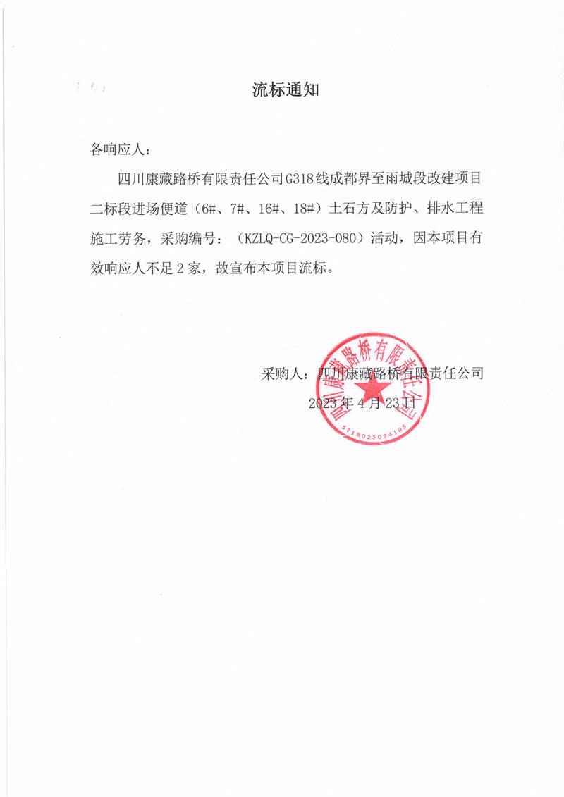 四川康藏路橋有限責任公司G318線成都至雨城段改建項目二標段進場便道(6#、7#、16#、18#)土石方及防護、排水工程施工勞務流標通知