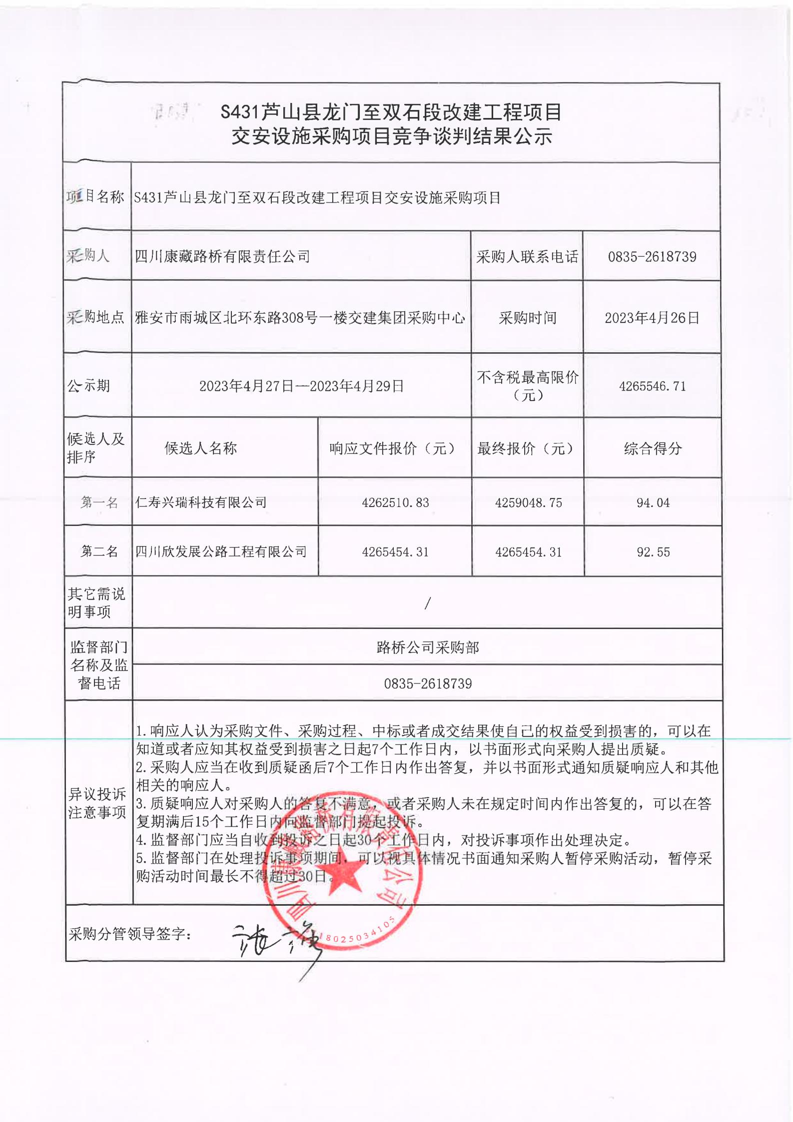 四川康藏路橋有限責任公司S431蘆山縣龍門至雙石段改建工程項目交安設(shè)施采購項目競爭談判結(jié)果公示