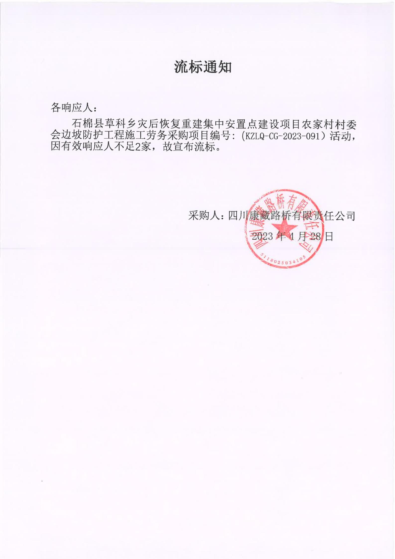 四川康藏路橋有限責任公司石棉草科鄉(xiāng)災后恢復重建集中安置點建設項目農(nóng)家村村委會邊坡防護工程施工勞務流標通知