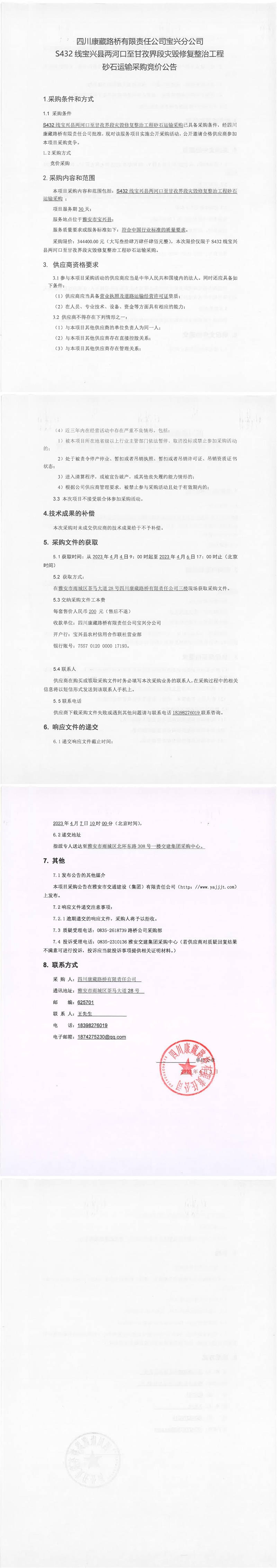 四川康藏路橋有限責(zé)任公司寶興分公司S432寶興縣兩河口至甘孜界段災(zāi)毀修復(fù)整治工程砂石運(yùn)輸采購競(jìng)價(jià)公告