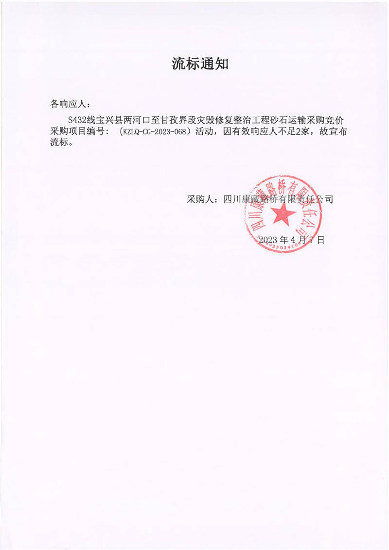 四川康藏路橋有限責任公司寶興分公司S432寶興縣兩河口至甘孜界段災毀修復整治工程砂石運輸采購流標通知