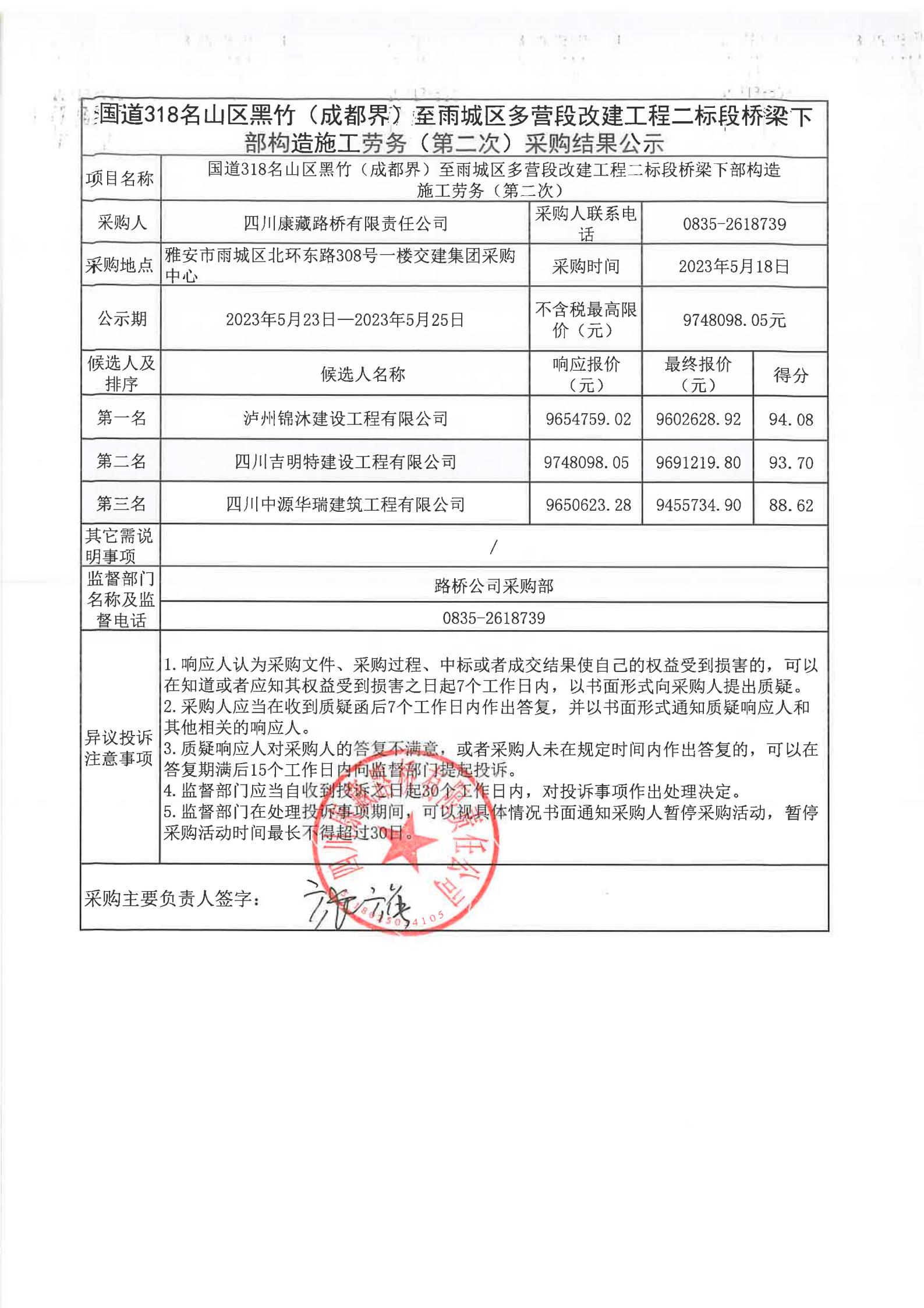四川康藏路橋有限責任公司國道318名山區(qū)黑竹(成都界)至雨城區(qū)多營段改建工程二標段橋梁下部構(gòu)造施工勞務(第二次)采購結(jié)果公示