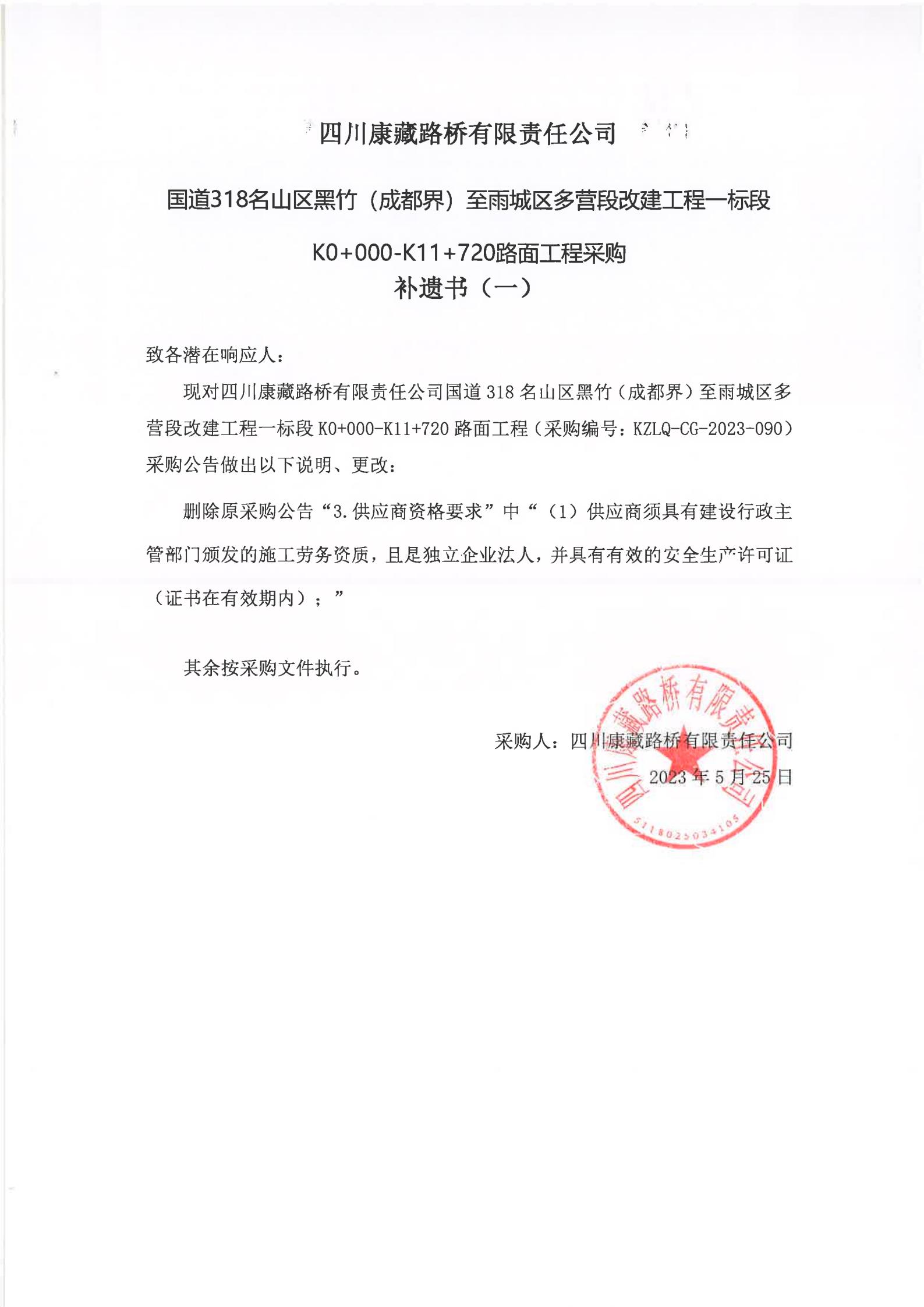 四川康藏路橋有限責(zé)任公司國(guó)道318名山區(qū)黑竹(成都界)至雨城區(qū)多營(yíng)段改建工程一標(biāo)段K0+000-K11+720路面工程采購補(bǔ)遺書(一)