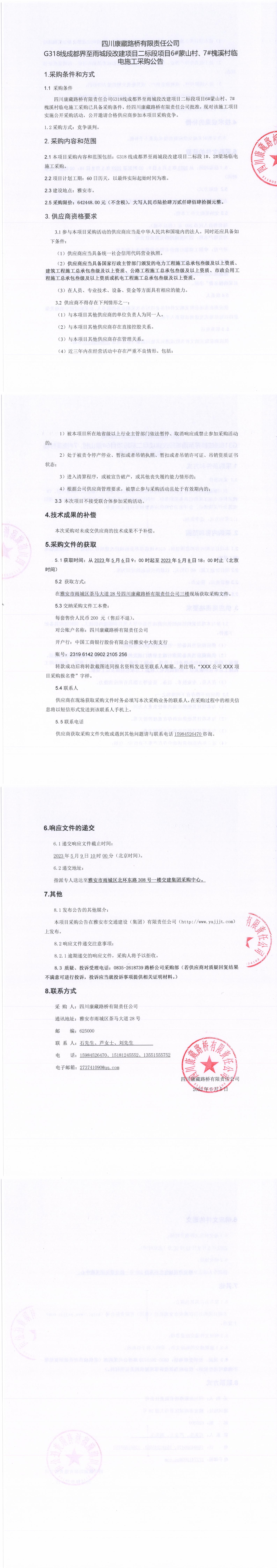 四川康藏路橋有限責任公司G318線成都至雨城段改建項目二標段項目6#蒙山村、7#槐溪村臨時電施工采購公告