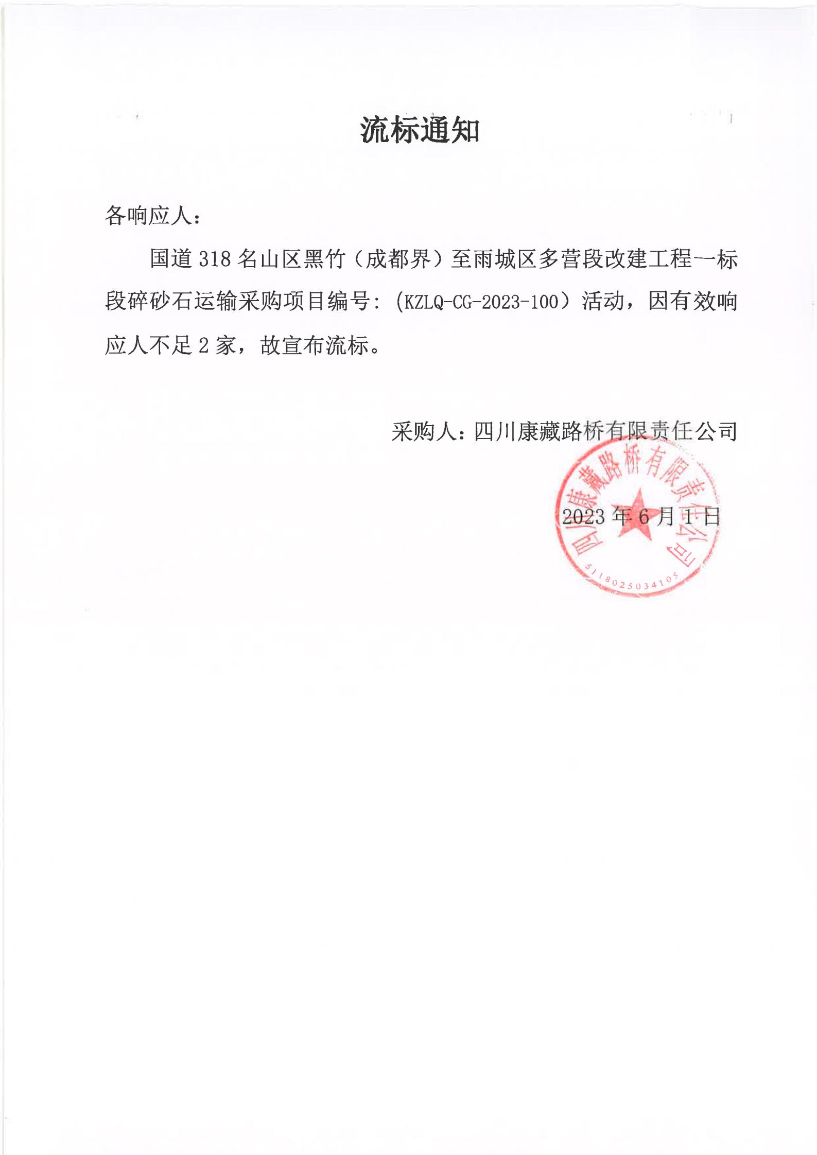 四川康藏路橋有限責(zé)任公司國道318名山區(qū)黑竹(成都界)至雨城區(qū)多營段改建工程一標(biāo)段碎砂石運輸采購流標(biāo)通知