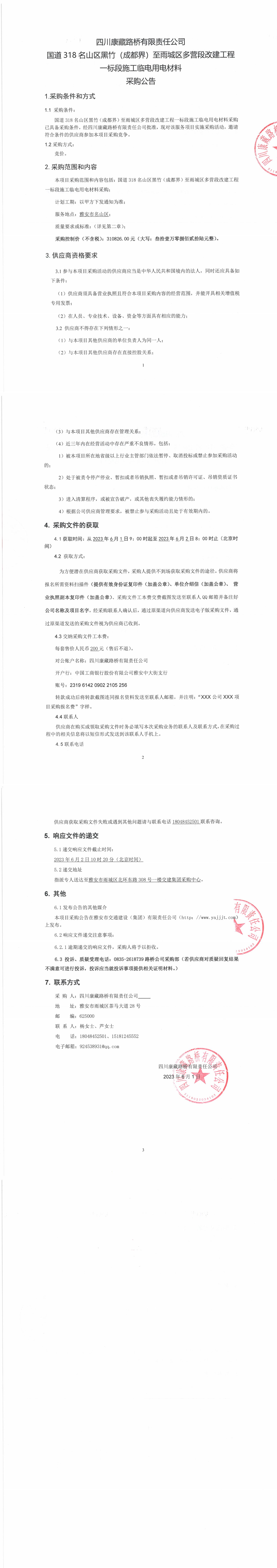 四川康藏路橋有限責(zé)任公司國道318名山區(qū)黑竹(成都界)至雨城區(qū)多營段改建工程一標(biāo)段施工臨電用電材料采購公告