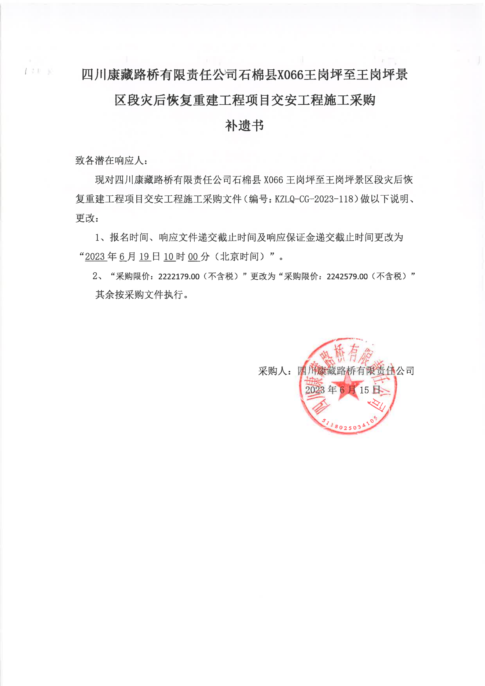 四川康藏路橋有限責(zé)任公司石棉縣X066王崗坪至王崗坪景區(qū)段災(zāi)后恢復(fù)重建工程項目交安工程施工補(bǔ)遺書