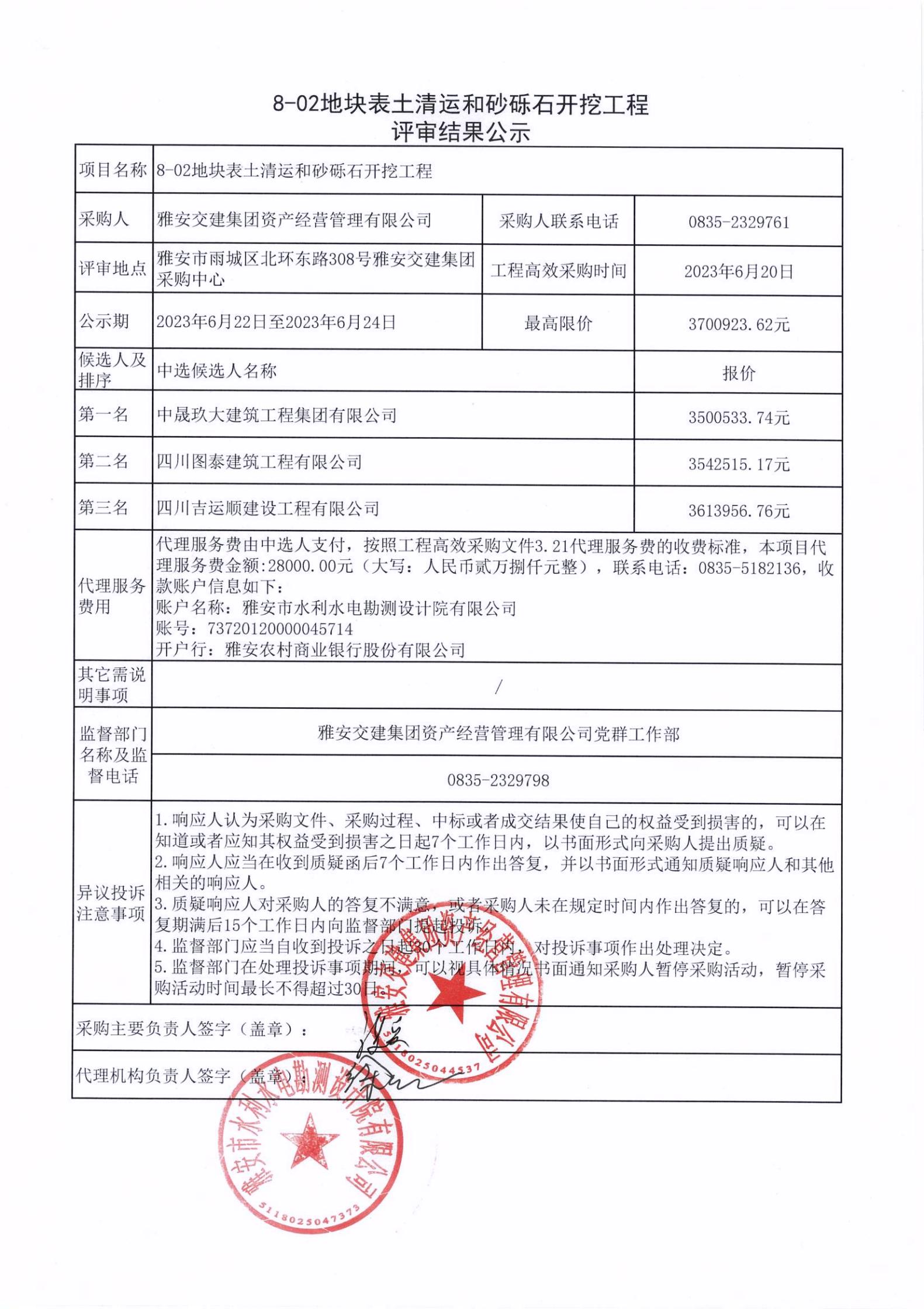 雅安交建集團資產(chǎn)經(jīng)營管理有限公司8-02地塊表土清運和砂礫石開挖工程項目評審結果公示
