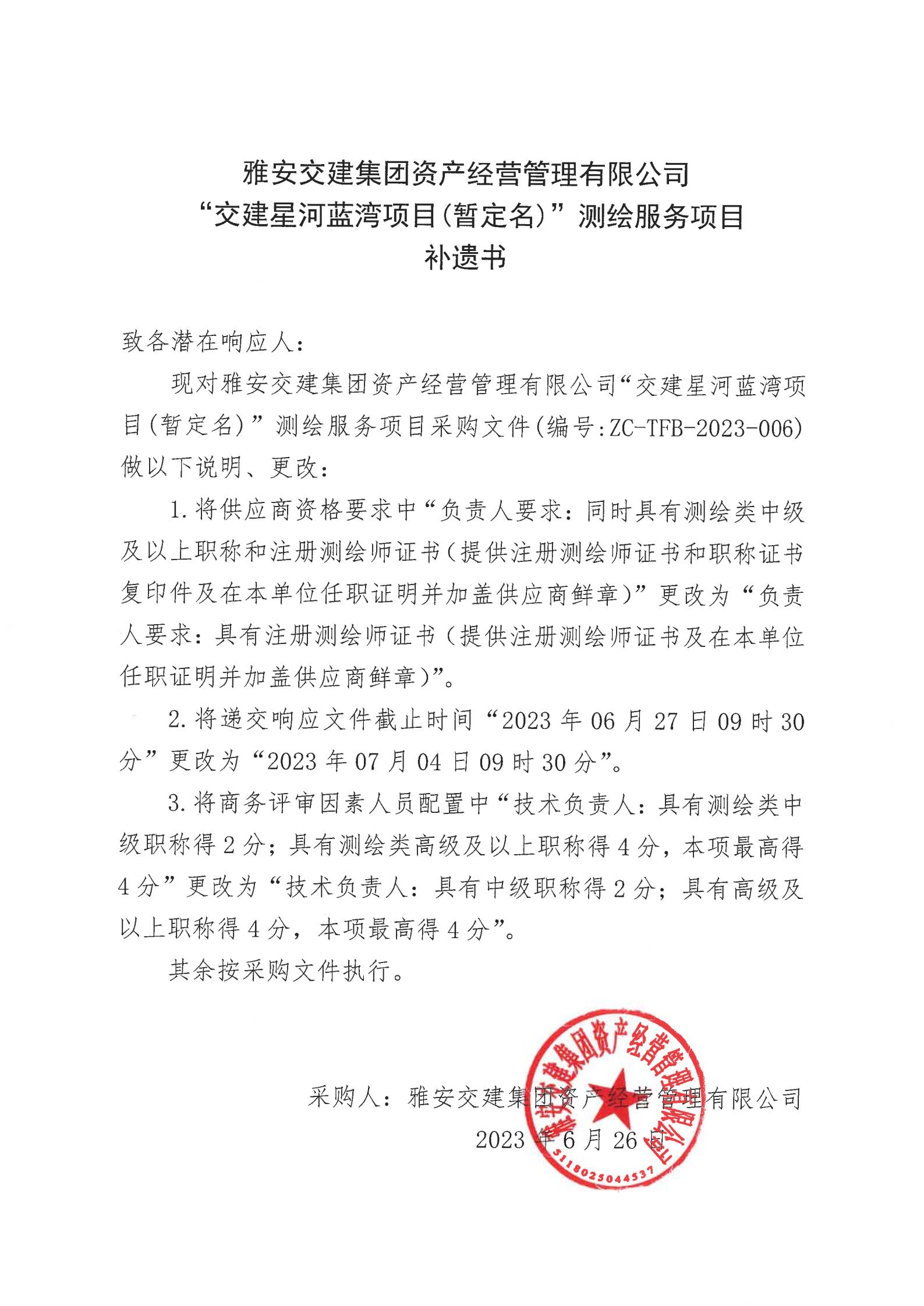 雅安交建集團(tuán)資產(chǎn)經(jīng)營(yíng)管理有限公司“交建星河藍(lán)灣項(xiàng)目(暫定名)”測(cè)繪服務(wù)項(xiàng)目補(bǔ)遺書(shū)