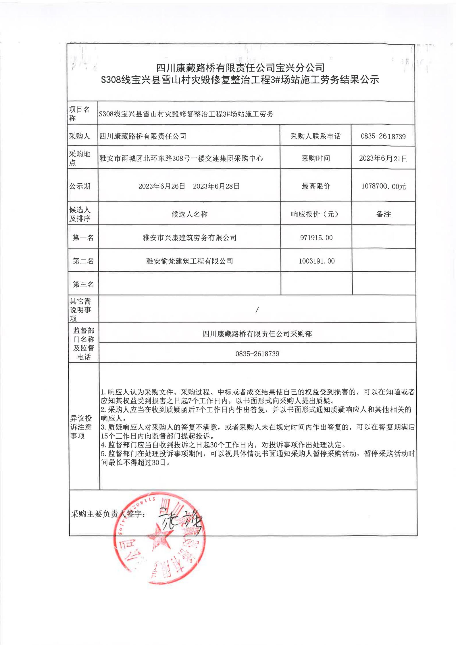四川康藏路橋有限責任公司寶興分公司S308線寶興縣雪山村段災(zāi)毀修復(fù)整治工程3#場站施工勞務(wù)結(jié)果公示