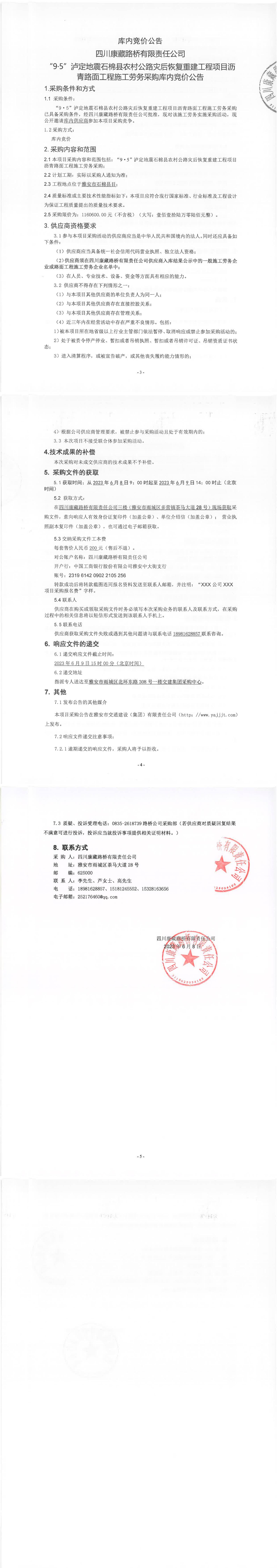 四川康藏路橋有限責(zé)任公司“9·5”瀘定地震石棉縣農(nóng)村公路災(zāi)后恢復(fù)重建工程項(xiàng)目瀝青路面工程施工勞務(wù)采購庫內(nèi)競(jìng)價(jià)公告