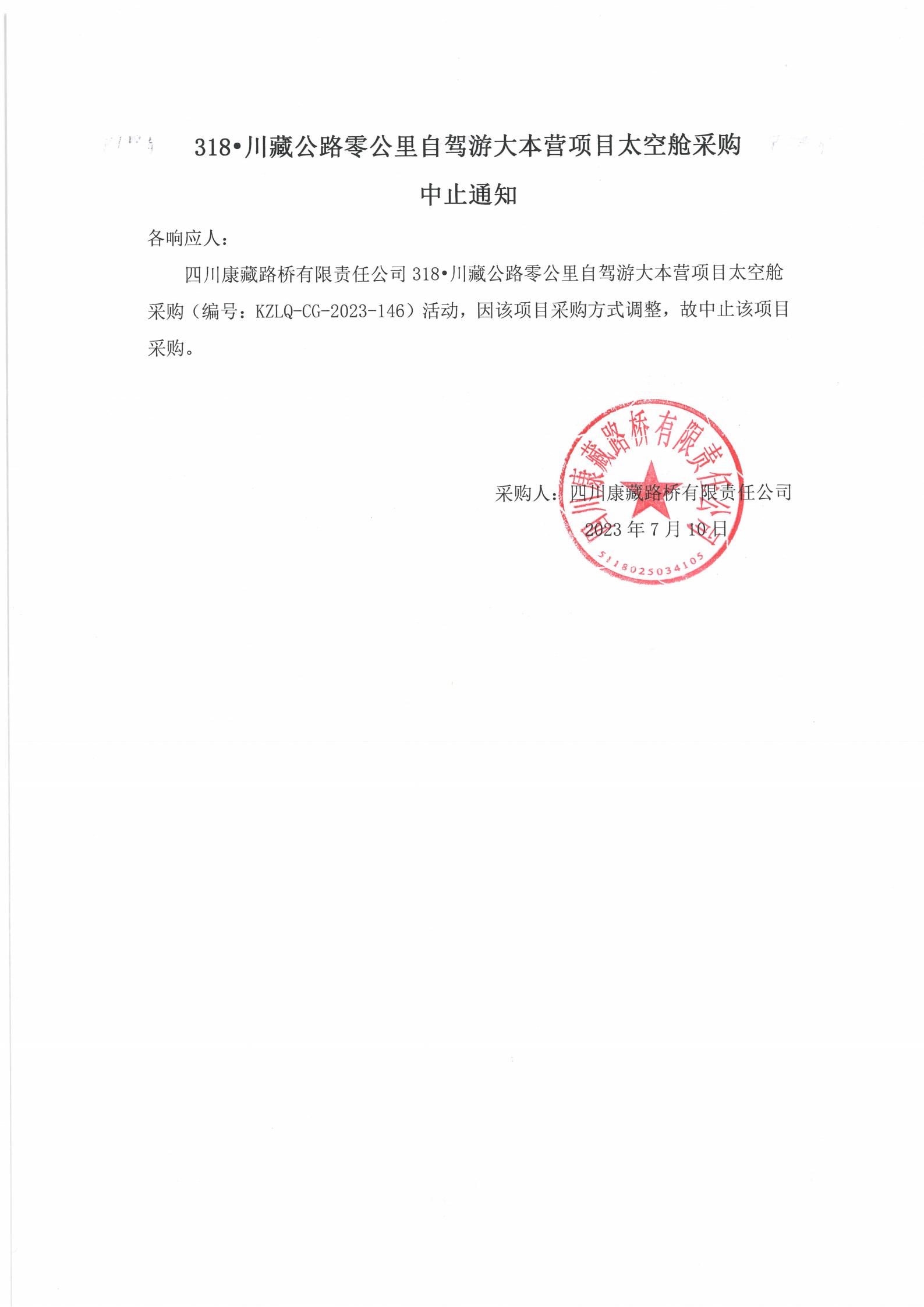 四川康藏路橋有限責任公司318·川藏公路零公里自駕游大本營項目太空艙采購中止通知
