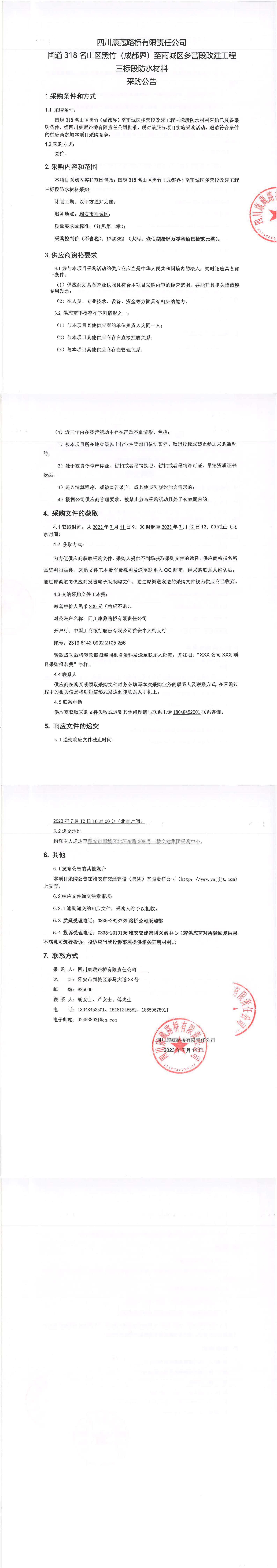 四川康藏路橋有限責任公司國道318名山區(qū)黑竹(成都界)至雨城區(qū)多營段改建工程三標段防水材料采購公告