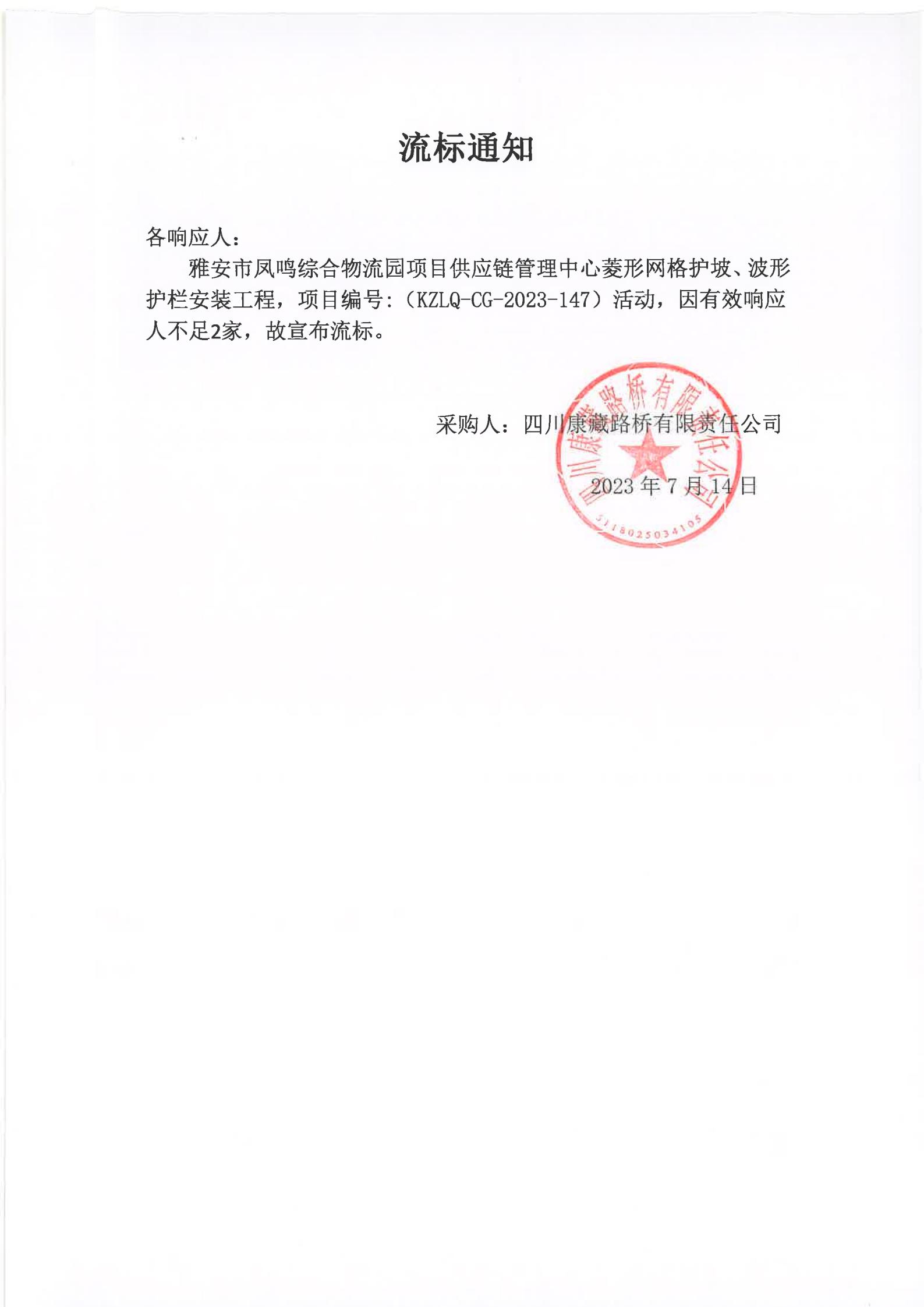 四川康藏路橋有限責(zé)任公司雅安市鳳鳴綜合物流園項(xiàng)目供應(yīng)鏈管理中心菱形網(wǎng)格護(hù)坡、波形護(hù)欄安裝工程采購(gòu)流標(biāo)通知