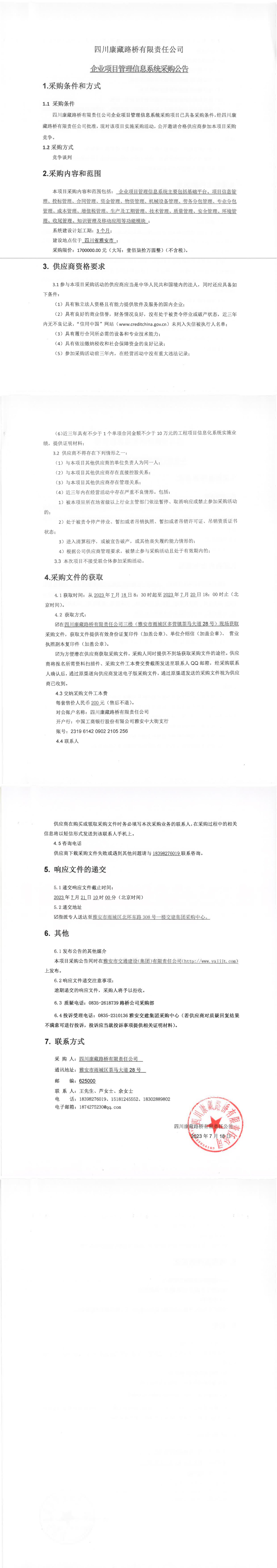 四川康藏路橋有限責任公司企業(yè)項目管理信息系統(tǒng)采購公告