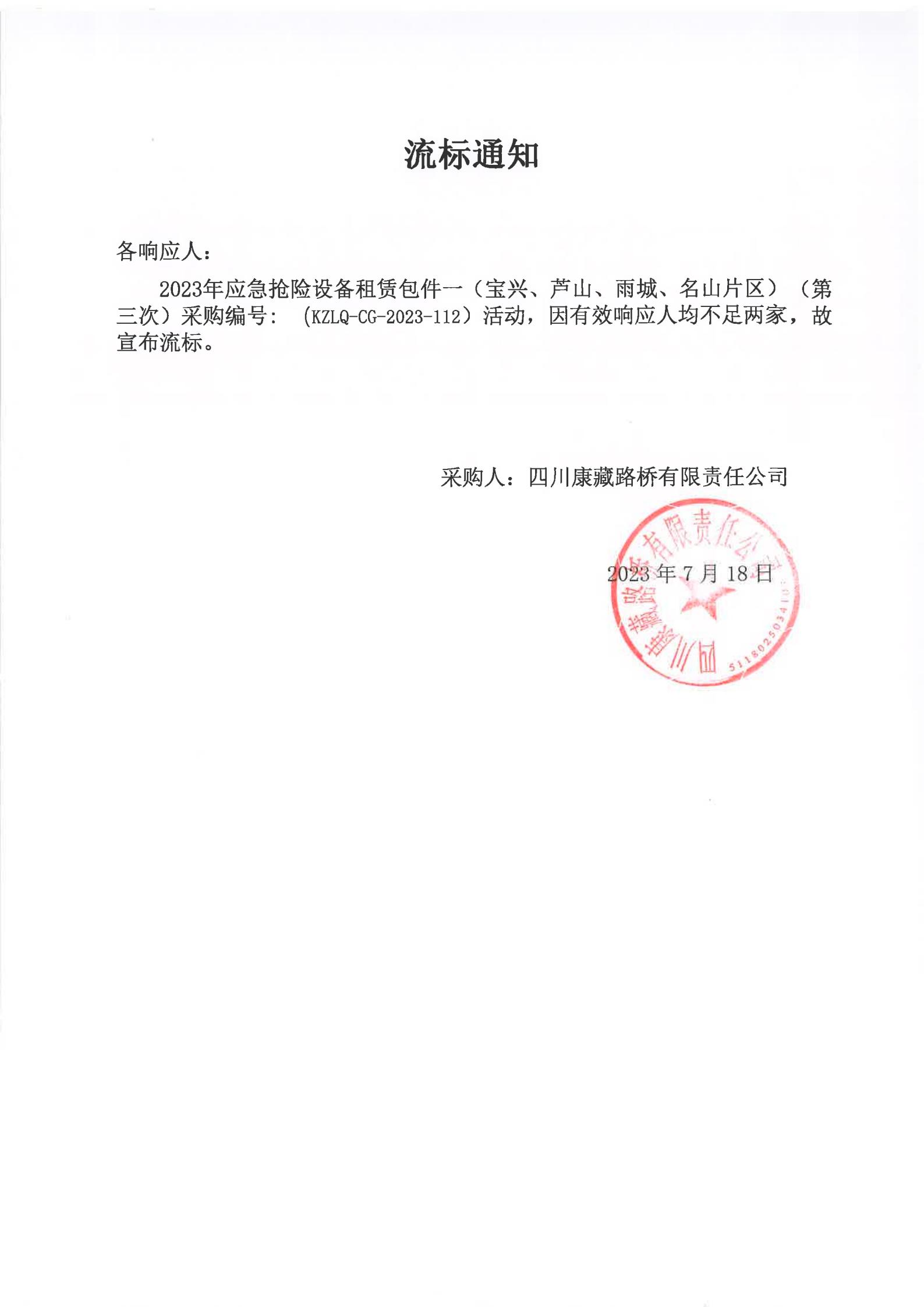 四川康藏路橋有限責任公司2023年應急搶險設(shè)備租賃包件一(寶興、蘆山、雨城、名山片區(qū))(第三次)流標通知