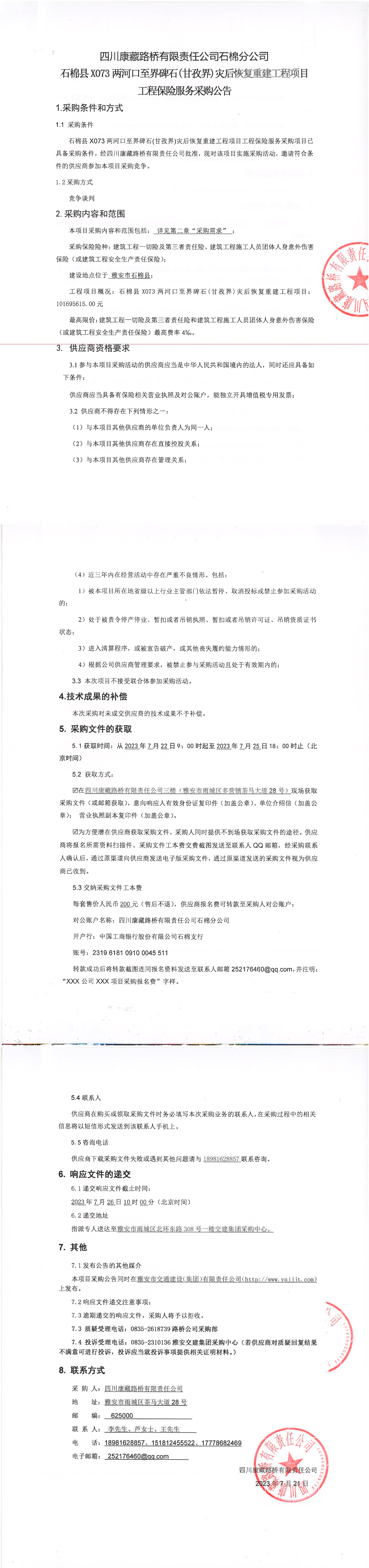 四川康藏路橋有限責任公司石棉縣X073兩河口至界碑石(甘孜界)災后恢復重建工程項目工程保險服務采購公告