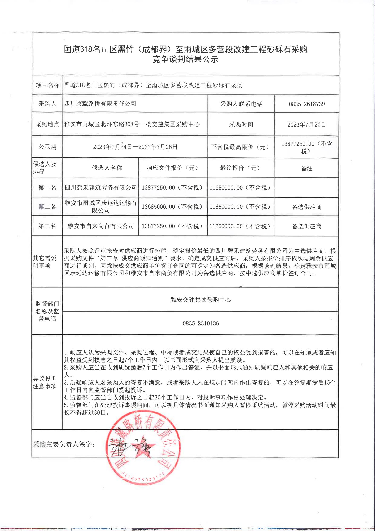 四川康藏路橋有限責(zé)任公司國(guó)道318名山區(qū)黑竹(成都界)至雨城區(qū)多營(yíng)段改建工程砂礫石采購競(jìng)爭(zhēng)談判結(jié)果公示
