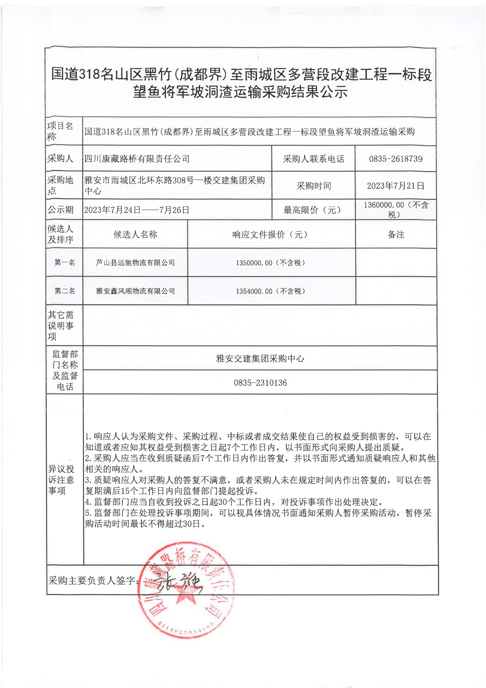 四川康藏路橋有限責任公司國道318名山區(qū)黑竹(成都界)至雨城區(qū)多營段改建工程一標段望魚將軍坡洞渣運輸采購結果公示