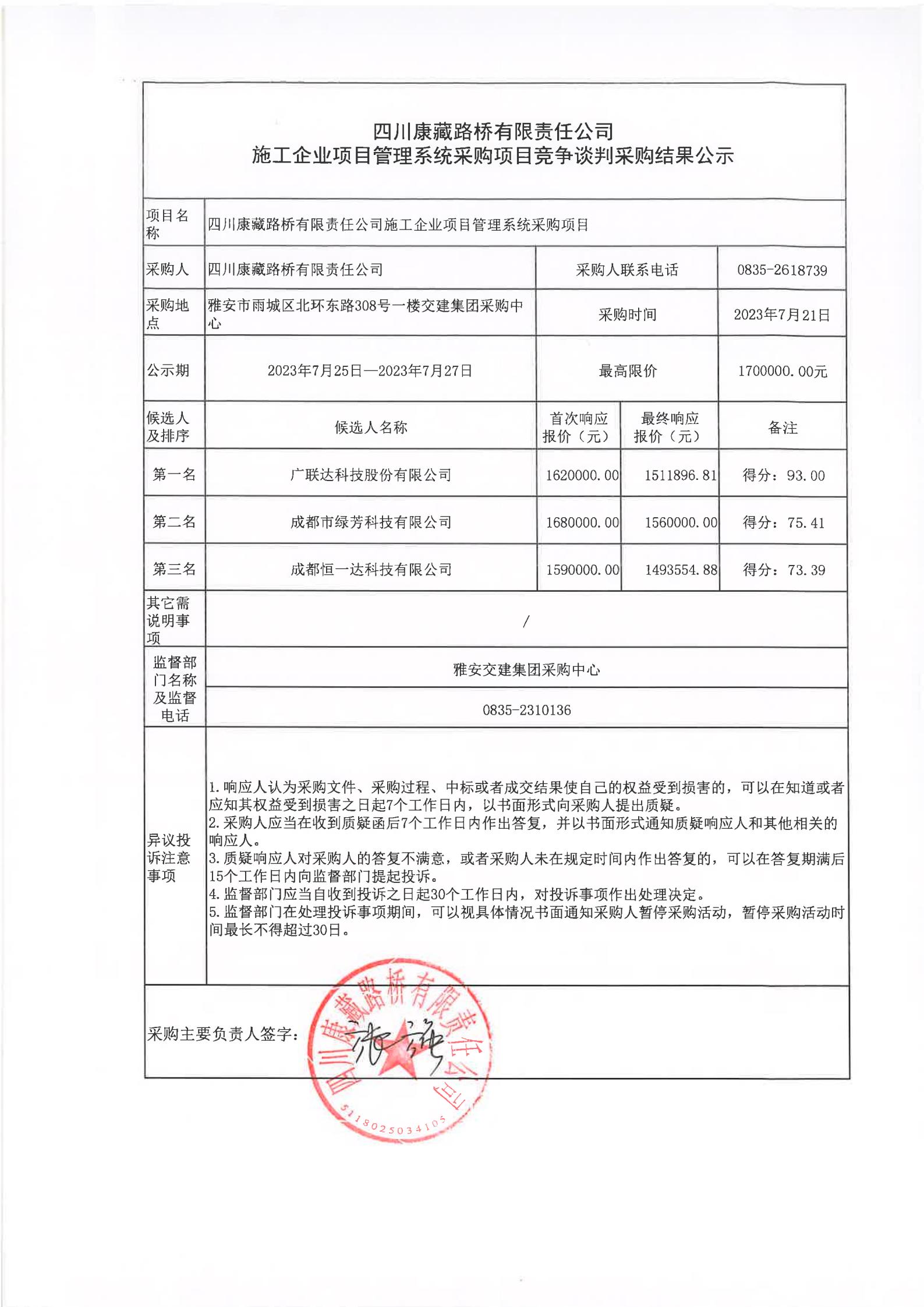 四川康藏路橋有限責任公司施工企業(yè)項目管理系統(tǒng)采購項目競爭談判采購結果公示
