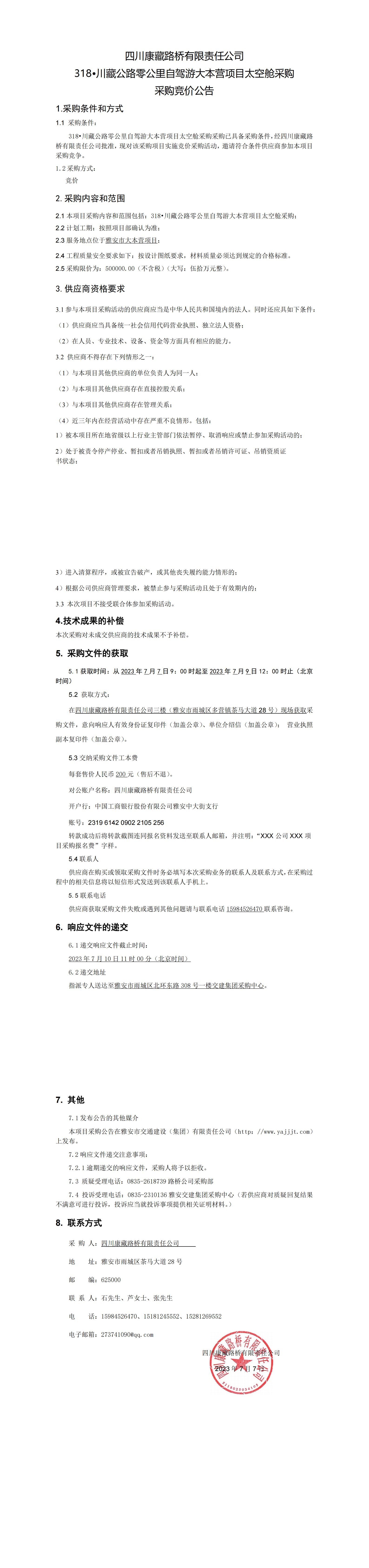 四川康藏路橋有限責(zé)任公司318·川藏公路零公里自駕游大本營項目太空艙采購競價公告