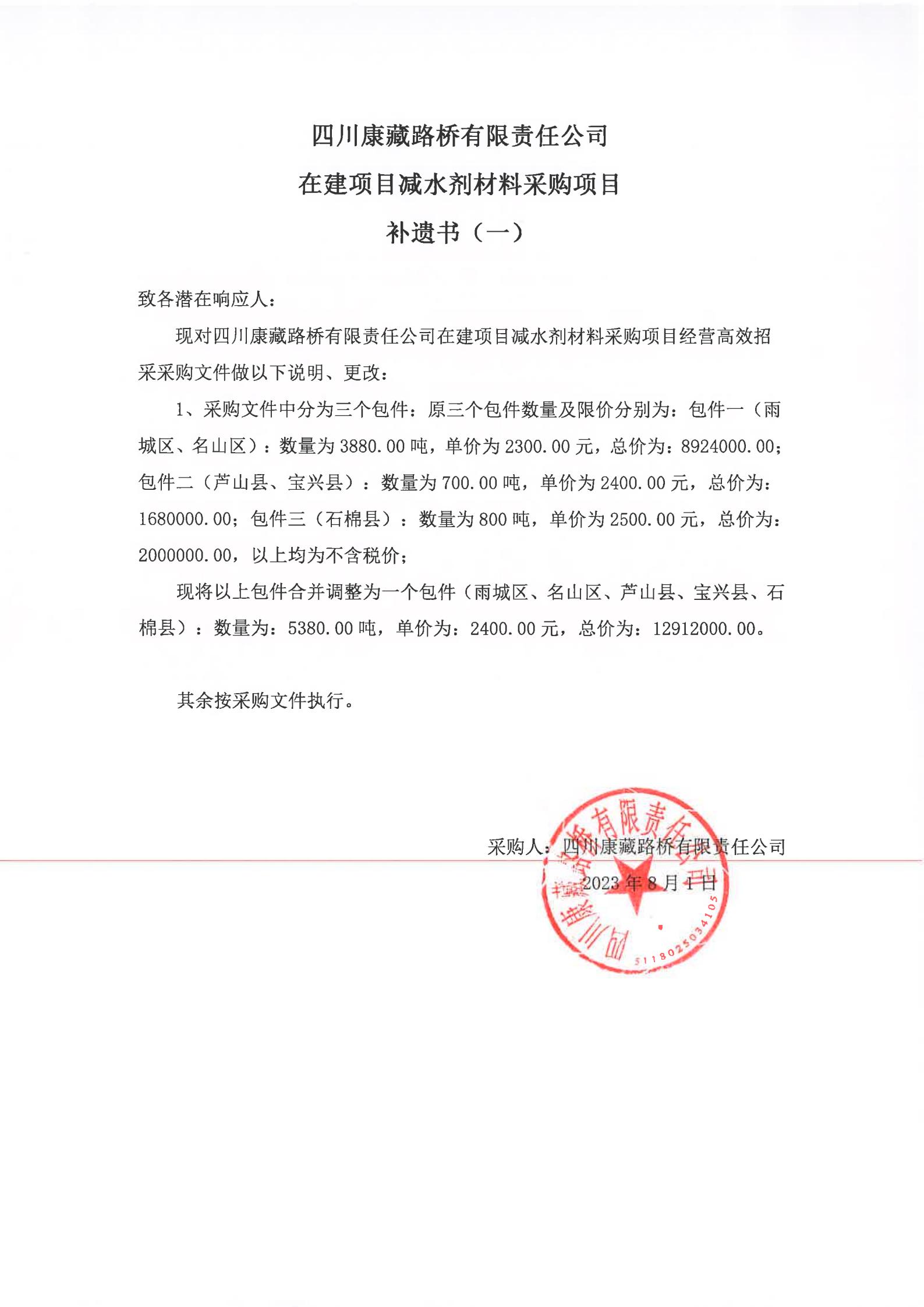 四川康藏路橋有限責(zé)任公司在建項目減水劑材料采購項目補遺書(一)