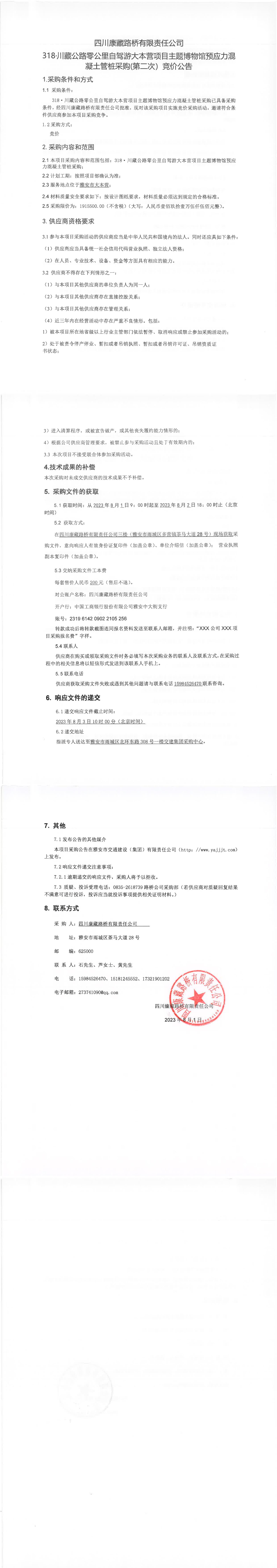 四川康藏路橋有限責(zé)任公司318·川藏公路零公里自駕游大本營(yíng)項(xiàng)目主題博物館預(yù)應(yīng)力混凝土管樁采購(gòu)(第二次)競(jìng)價(jià)公告