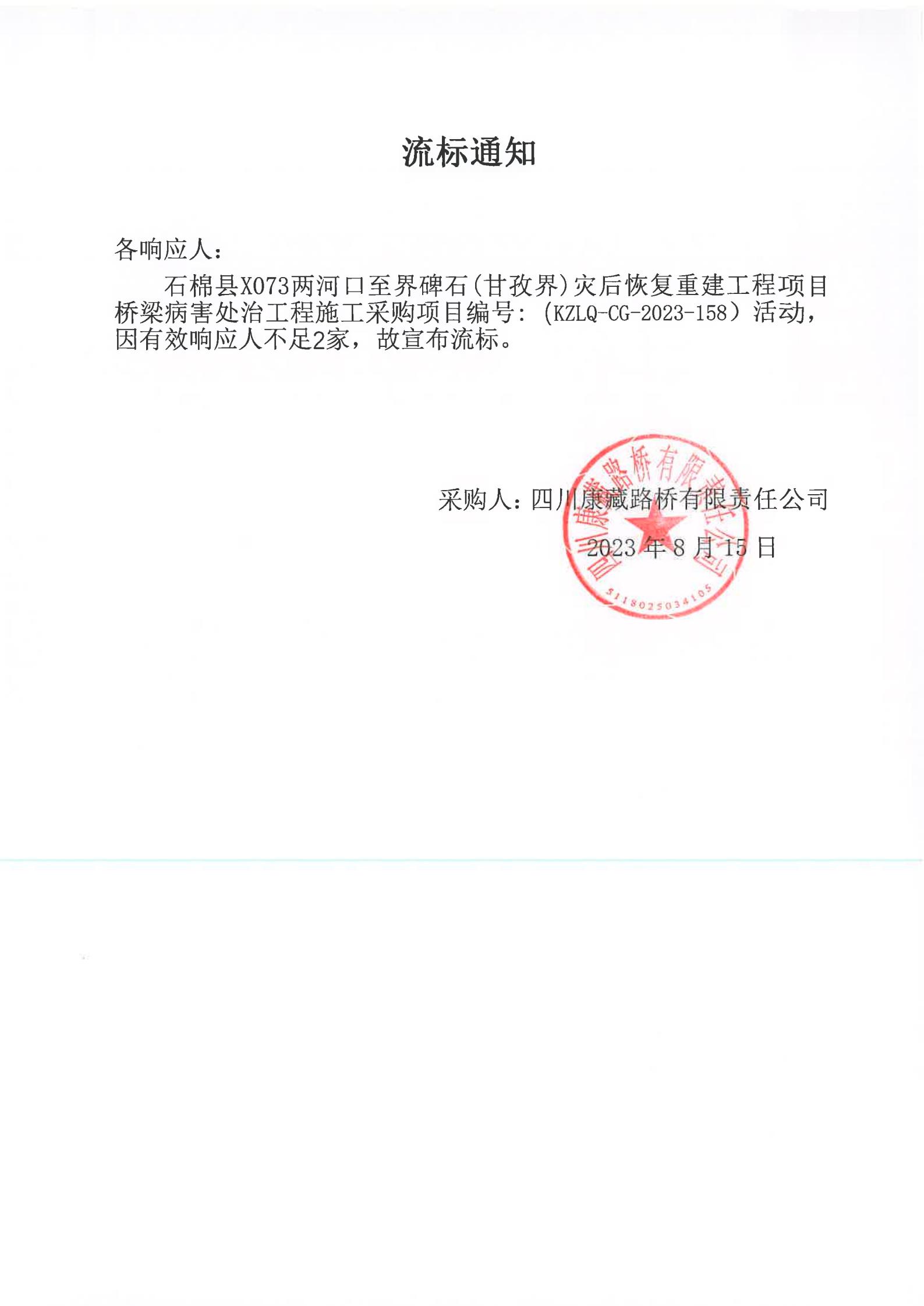 四川康藏路橋有限責(zé)任公司石棉縣X703兩河口至界碑石(甘孜界)災(zāi)后恢復(fù)重建工程項(xiàng)目橋梁病害處治工程施工流標(biāo)通知