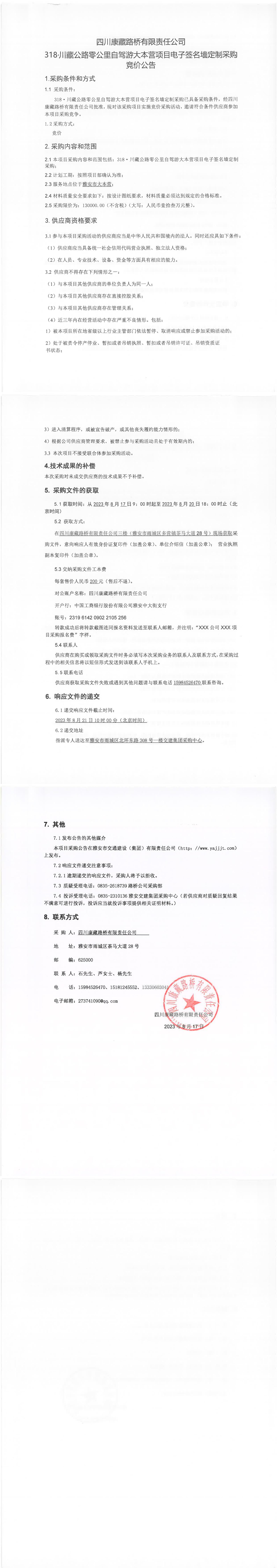 四川康藏路橋有限責(zé)任公司318·川藏公路零公里自駕游大本營項(xiàng)目電子簽名墻定制采購競價公告