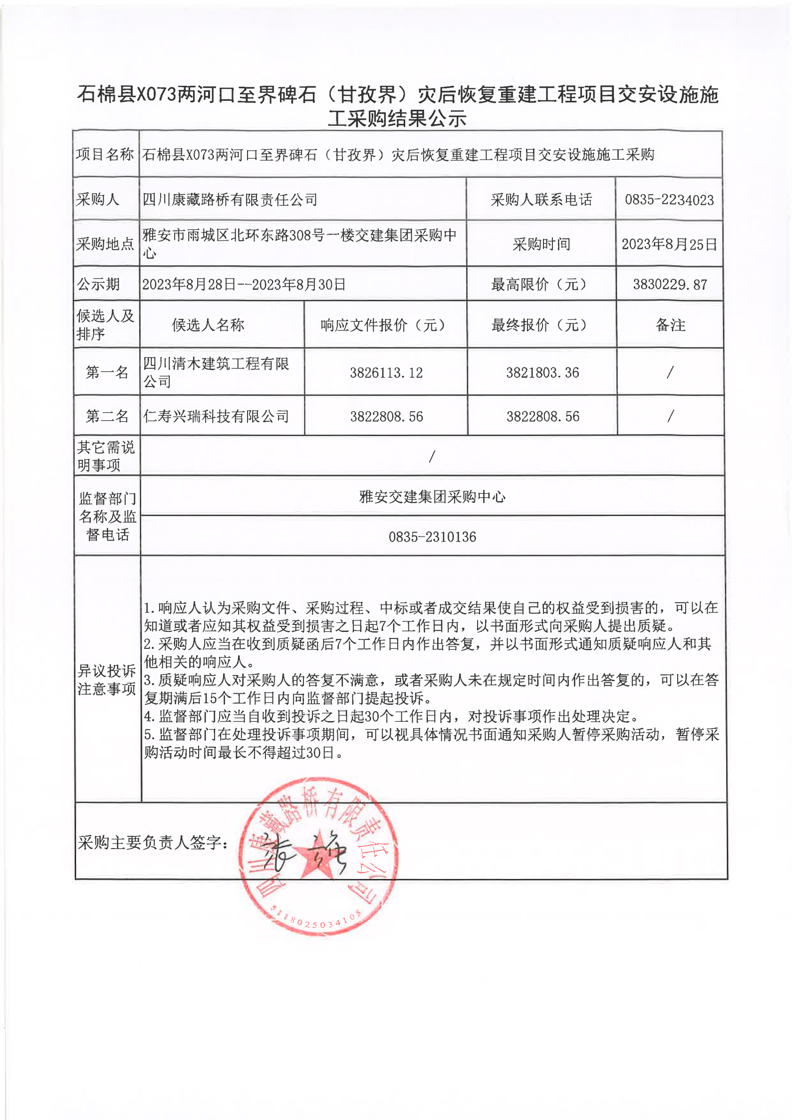 四川康藏路橋有限責任公司石棉縣X073兩河口至界碑石(甘孜界)災后恢復重建工程項目交安設施施工采購結果公示