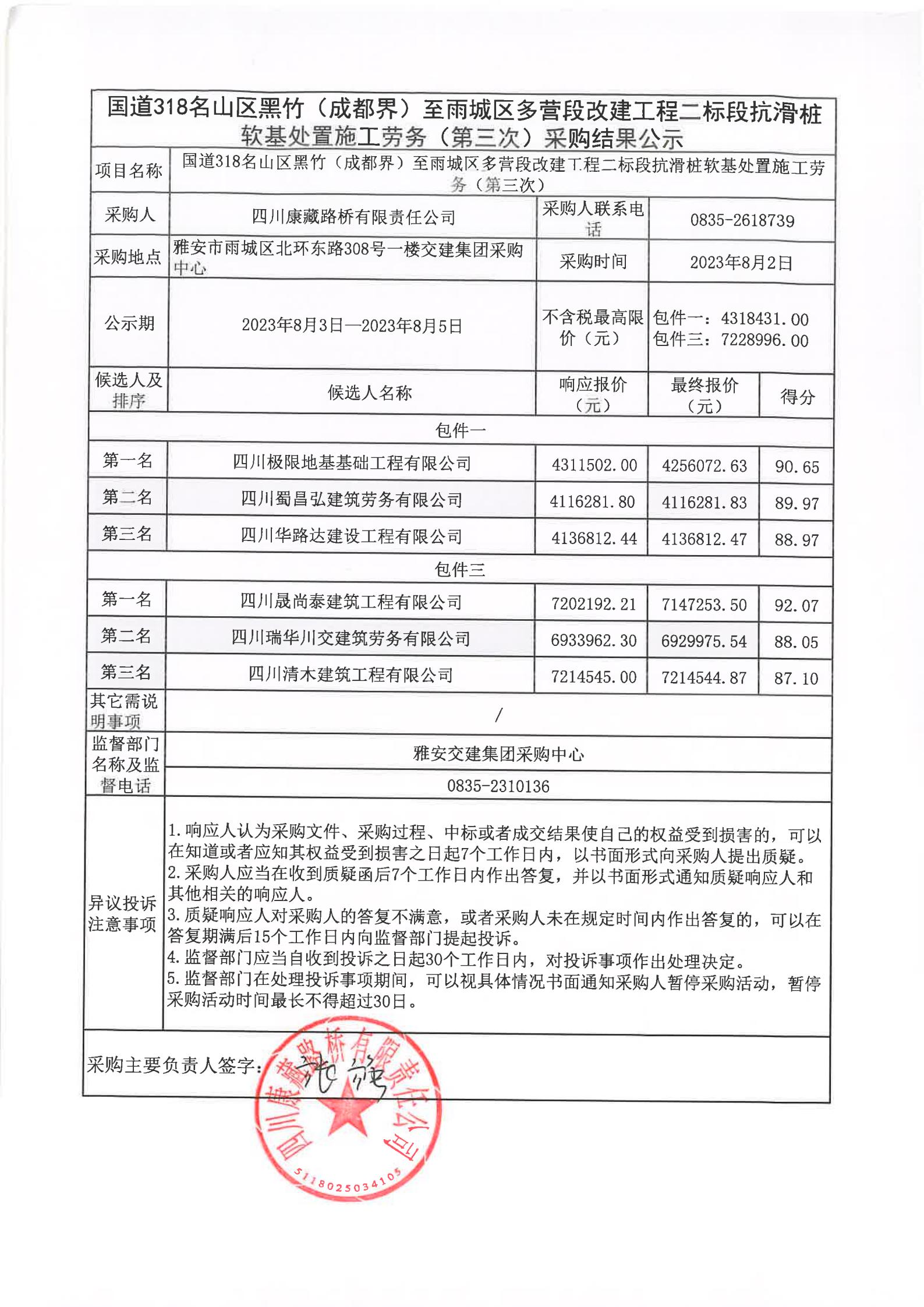 四川康藏路橋有限責任公司國道318名山區(qū)黑竹(成都界)至雨城區(qū)多營段改建工程二標段抗滑樁軟基處置施工勞務(第三次)采購結果公示