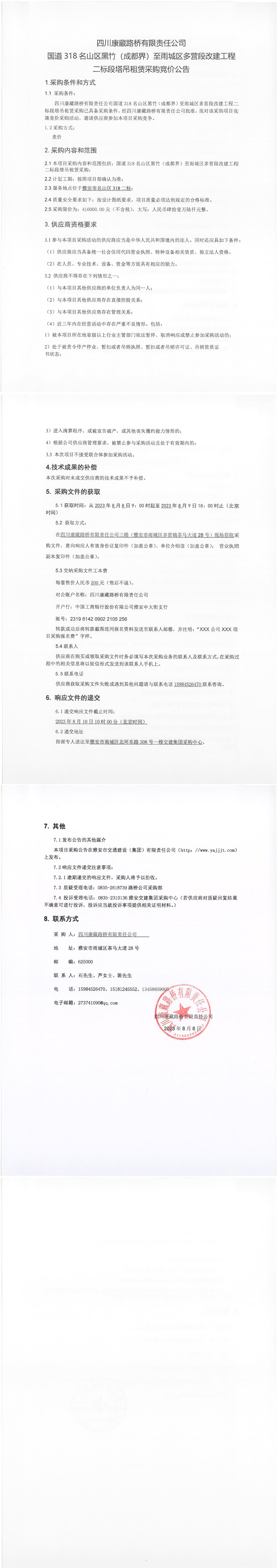 四川康藏路橋有限責(zé)任公司國道318名山區(qū)黑竹(成都界)至雨城區(qū)多營段改建工程二標(biāo)段塔吊租賃采購競價公告