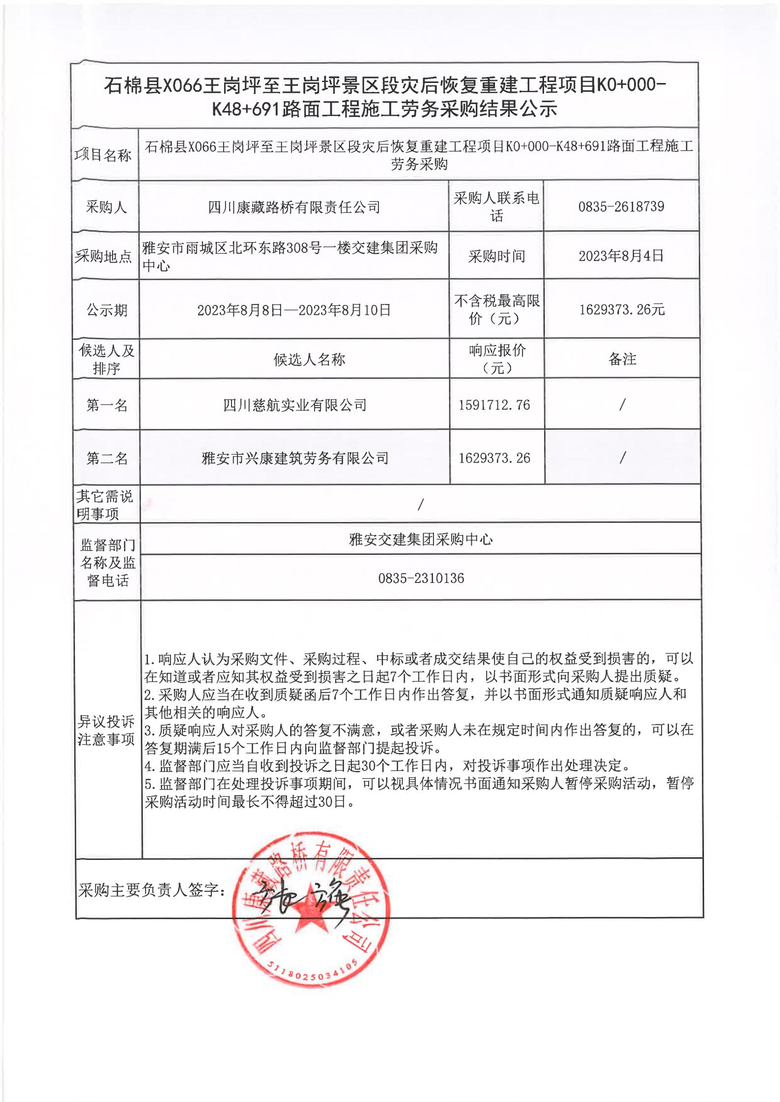 四川康藏路橋有限責任公司石棉縣X066王崗坪至王崗坪景區(qū)段災后恢復重建工程項目K0+000-K48+691路面工程施工勞務采購結(jié)果公示