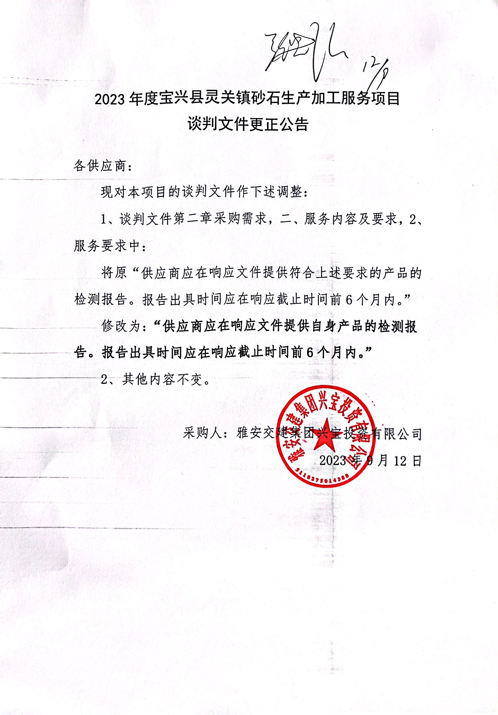 雅安交建集團(tuán)興寶投資有限公司2023年度寶興縣靈關(guān)鎮(zhèn)砂石生產(chǎn)加工服務(wù)項目談判文件更正公告