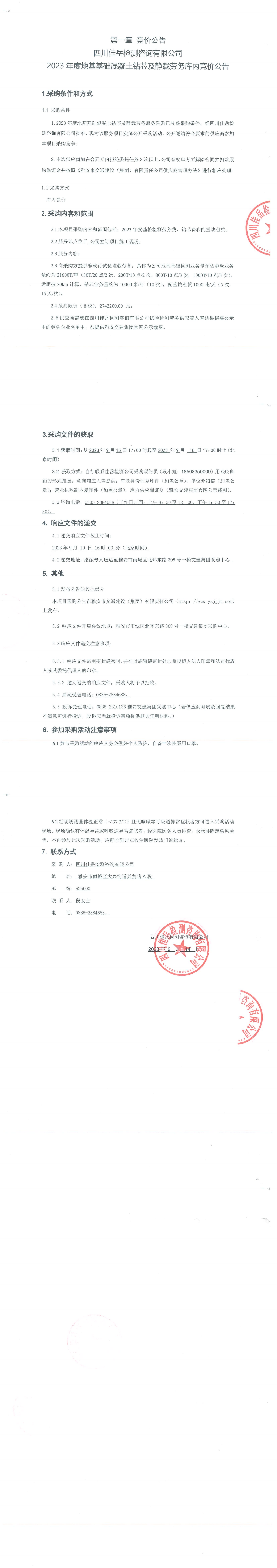 四川佳岳檢測咨詢有限公司2023年度地基基礎(chǔ)混凝土鉆芯及靜載勞務(wù)庫內(nèi)競價(jià)公告