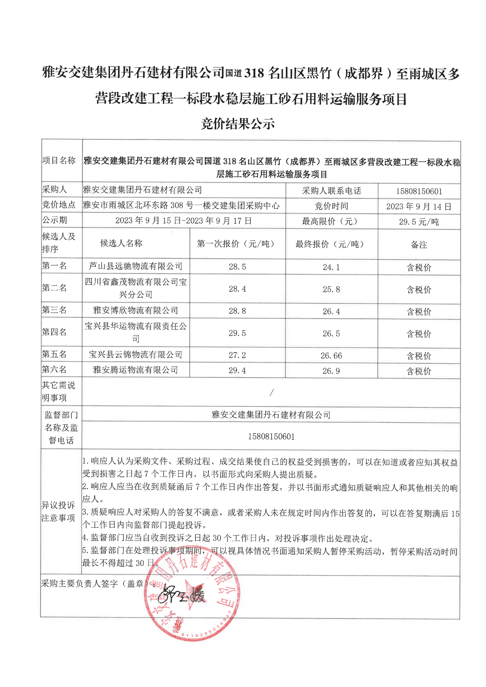 雅安交建集團丹石建材有限公司國道318名山區(qū)黑竹(成都界)至雨城區(qū)多營段改建工程一標(biāo)段水穩(wěn)層施工砂石用料運輸服務(wù)項目競價結(jié)果公示