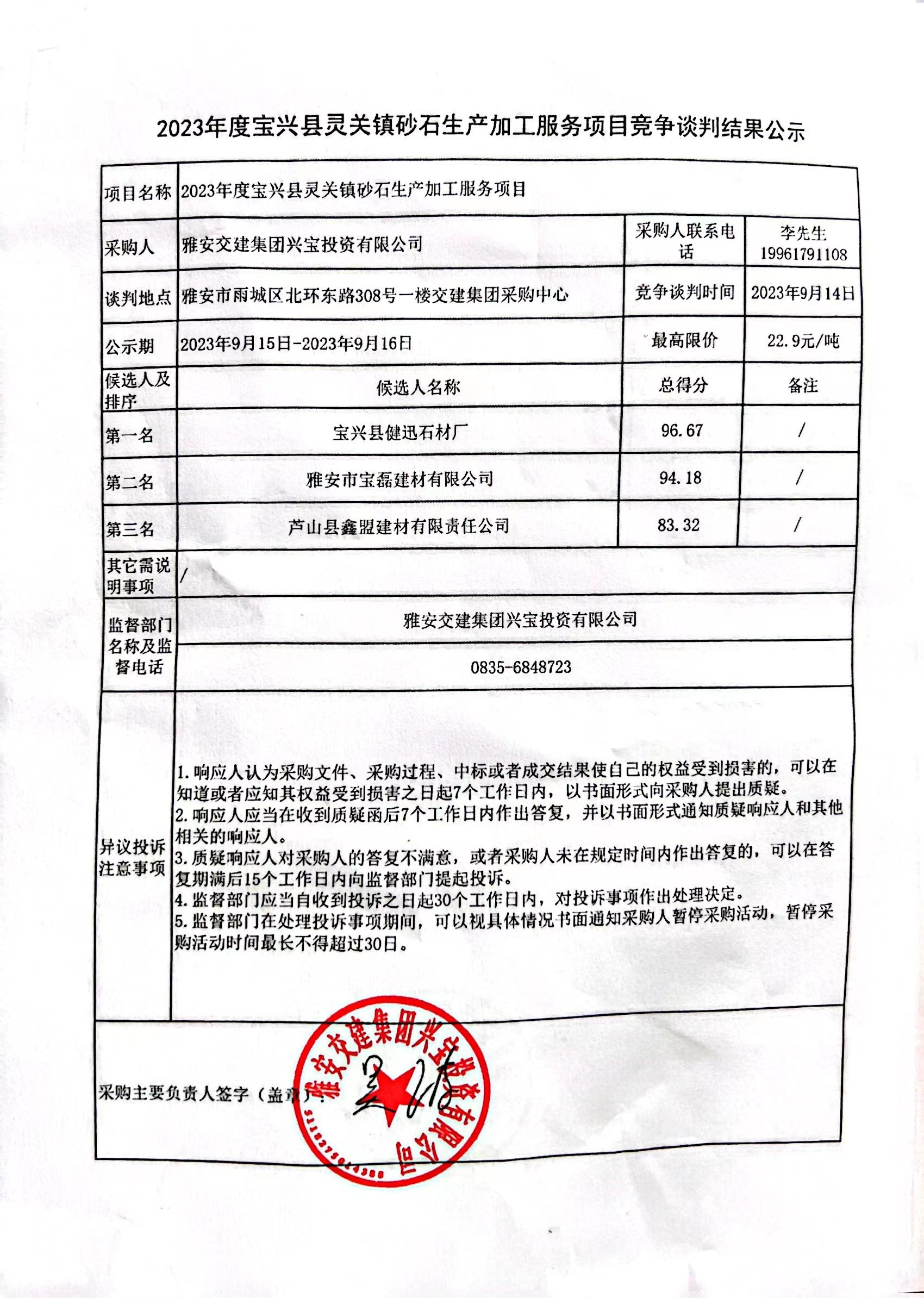 雅安交建集團興寶投資有限公司2023年度寶興縣靈關(guān)鎮(zhèn)砂石生產(chǎn)加工服務(wù)項目競爭談判結(jié)果公示