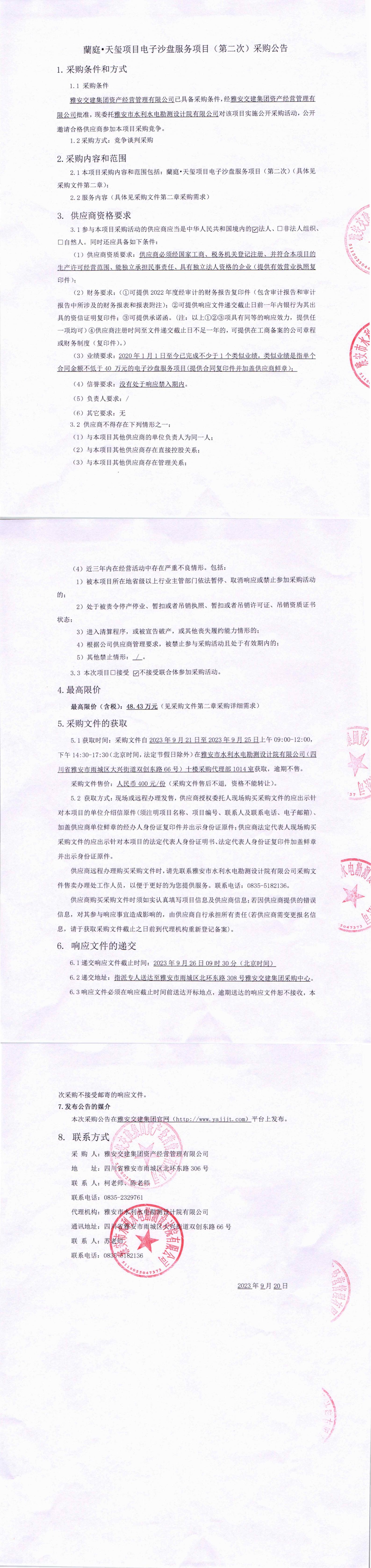 雅安交建集團(tuán)資產(chǎn)經(jīng)營(yíng)管理有限公司蘭庭·天璽項(xiàng)目電子沙盤(pán)服務(wù)項(xiàng)目(第二次)采購(gòu)公告